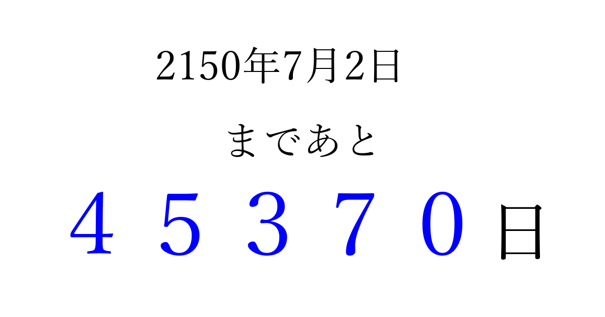 2150年7月2日(木)まで あと 99999 日です 追加すると、トップページからすぐ選べるようになります ※2026/04/13現在の結果です。 最新の状態に更新する ↓シェアして、タイムライン上にカウントダウンを表示しよう!↓ 📤 この結果を共有する Tweet シェア Threads Bluesky 別の日付でカウントダウン 2150年7月のカレンダー このページをブックマークに追加すると、いつでもカウントダウンを確認できます。 (PC: Ctrl+D / Mac: ⌘+D) hitome-notes.comでは以下のページも運営しています。 指定日と期間から日付を計算 | ガチャ確率計算・シミュレーション | プライバシー・ポリシー 運営者:Avocado