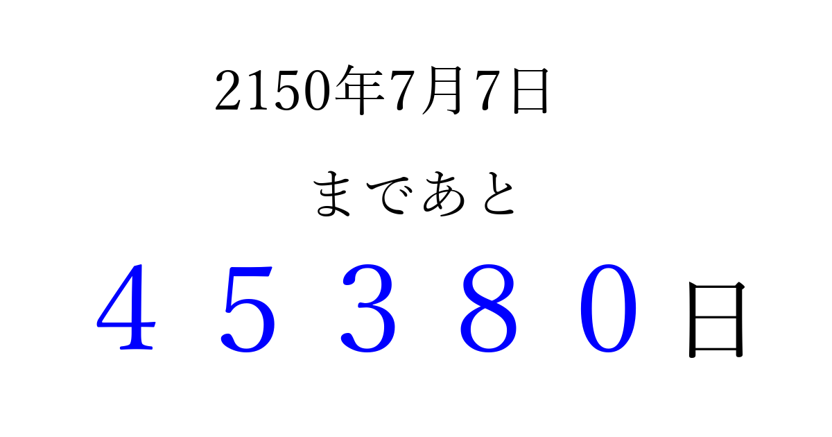 2150年7月7日(火)まで あと 99999 日です 追加すると、トップページからすぐ選べるようになります ※2026/04/08現在の結果です。 最新の状態に更新する ↓シェアして、タイムライン上にカウントダウンを表示しよう!↓ 📤 この結果を共有する Tweet シェア Threads Bluesky 別の日付でカウントダウン 2150年7月のカレンダー このページをブックマークに追加すると、いつでもカウントダウンを確認できます。 (PC: Ctrl+D / Mac: ⌘+D) hitome-notes.comでは以下のページも運営しています。 指定日と期間から日付を計算 | ガチャ確率計算・シミュレーション | プライバシー・ポリシー 運営者:Avocado
