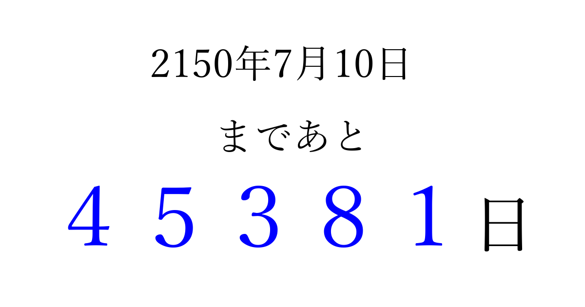 2150年7月10日(金)まで あと 99999 日です 追加すると、トップページからすぐ選べるようになります ※2026/04/10現在の結果です。 最新の状態に更新する ↓シェアして、タイムライン上にカウントダウンを表示しよう!↓ 📤 この結果を共有する Tweet シェア Threads Bluesky 別の日付でカウントダウン 2150年7月のカレンダー このページをブックマークに追加すると、いつでもカウントダウンを確認できます。 (PC: Ctrl+D / Mac: ⌘+D) hitome-notes.comでは以下のページも運営しています。 指定日と期間から日付を計算 | ガチャ確率計算・シミュレーション | プライバシー・ポリシー 運営者:Avocado