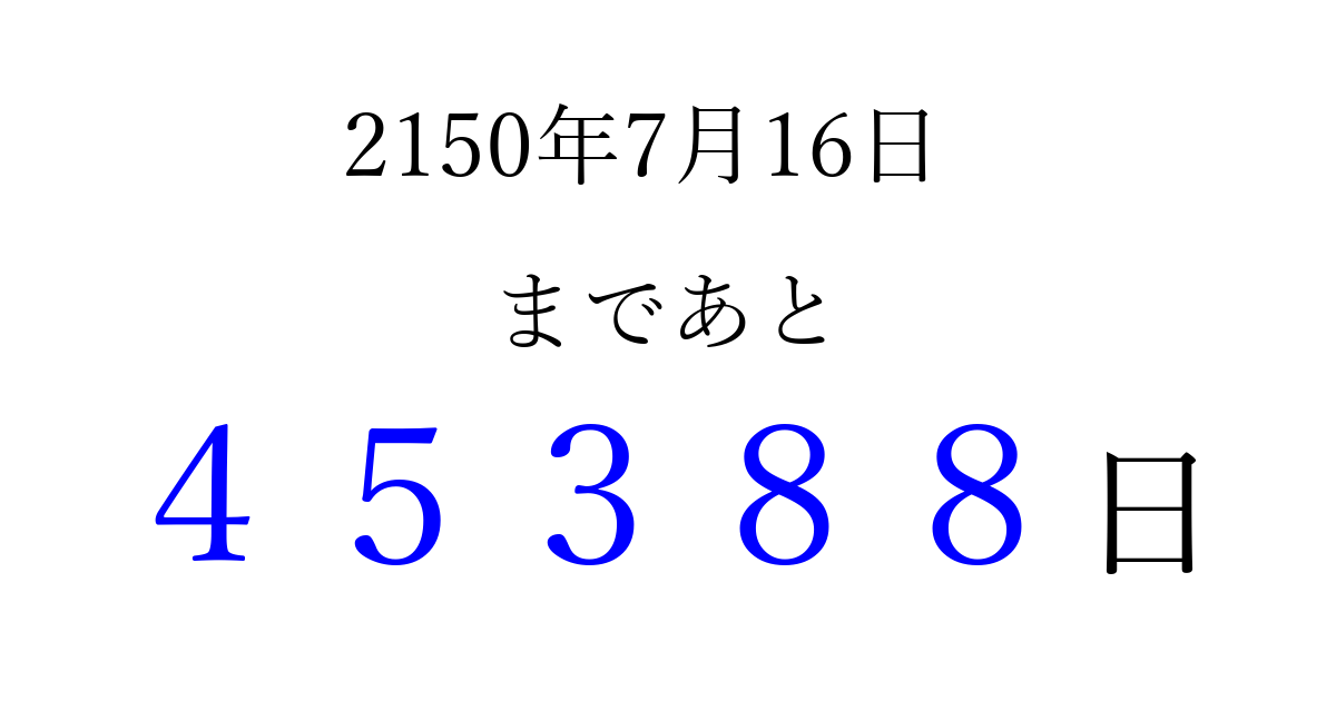 2150年7月16日(木)まで あと 99999 日です 追加すると、トップページからすぐ選べるようになります ※2026/04/09現在の結果です。 最新の状態に更新する ↓シェアして、タイムライン上にカウントダウンを表示しよう!↓ 📤 この結果を共有する Tweet シェア Threads Bluesky 別の日付でカウントダウン 2150年7月のカレンダー このページをブックマークに追加すると、いつでもカウントダウンを確認できます。 (PC: Ctrl+D / Mac: ⌘+D) hitome-notes.comでは以下のページも運営しています。 指定日と期間から日付を計算 | ガチャ確率計算・シミュレーション | プライバシー・ポリシー 運営者:Avocado