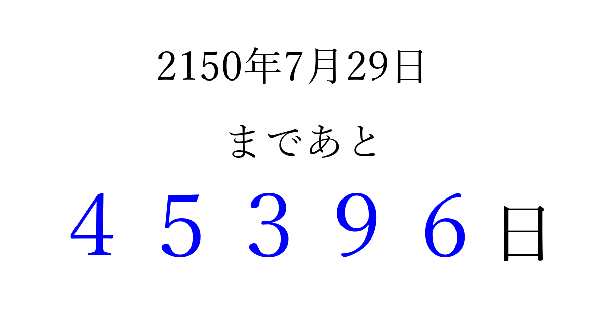 2150年7月29日(水)まで あと 99999 日です 追加すると、トップページからすぐ選べるようになります ※2026/04/14現在の結果です。 最新の状態に更新する ↓シェアして、タイムライン上にカウントダウンを表示しよう!↓ 📤 この結果を共有する Tweet シェア Threads Bluesky 別の日付でカウントダウン 2150年7月のカレンダー このページをブックマークに追加すると、いつでもカウントダウンを確認できます。 (PC: Ctrl+D / Mac: ⌘+D) hitome-notes.comでは以下のページも運営しています。 指定日と期間から日付を計算 | ガチャ確率計算・シミュレーション | プライバシー・ポリシー 運営者:Avocado