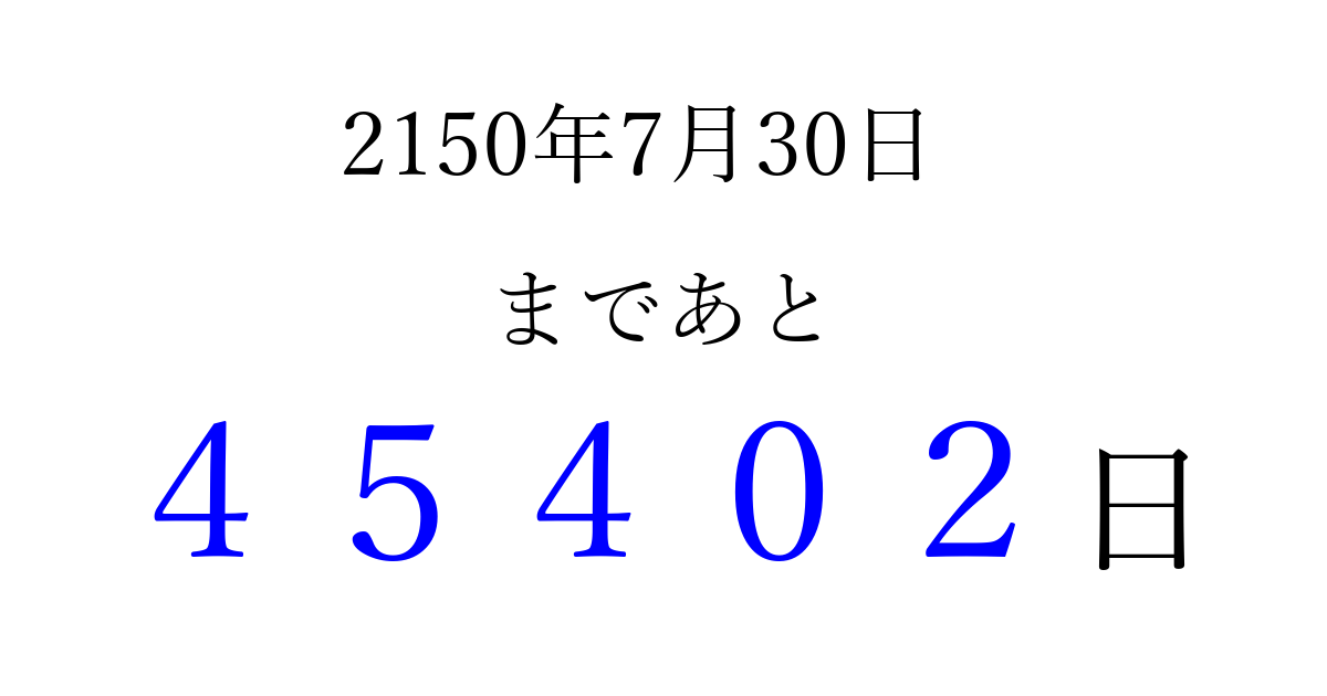 2150年7月30日(木)まで あと 99999 日です 追加すると、トップページからすぐ選べるようになります ※2026/04/09現在の結果です。 最新の状態に更新する ↓シェアして、タイムライン上にカウントダウンを表示しよう!↓ 📤 この結果を共有する Tweet シェア Threads Bluesky 別の日付でカウントダウン 2150年7月のカレンダー このページをブックマークに追加すると、いつでもカウントダウンを確認できます。 (PC: Ctrl+D / Mac: ⌘+D) hitome-notes.comでは以下のページも運営しています。 指定日と期間から日付を計算 | ガチャ確率計算・シミュレーション | プライバシー・ポリシー 運営者:Avocado