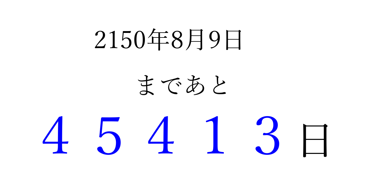2150年8月9日(日)まで あと 99999 日です 追加すると、トップページからすぐ選べるようになります ※2026/04/08現在の結果です。 最新の状態に更新する ↓シェアして、タイムライン上にカウントダウンを表示しよう!↓ 📤 この結果を共有する Tweet シェア Threads Bluesky 別の日付でカウントダウン 2150年8月のカレンダー このページをブックマークに追加すると、いつでもカウントダウンを確認できます。 (PC: Ctrl+D / Mac: ⌘+D) hitome-notes.comでは以下のページも運営しています。 指定日と期間から日付を計算 | ガチャ確率計算・シミュレーション | プライバシー・ポリシー 運営者:Avocado
