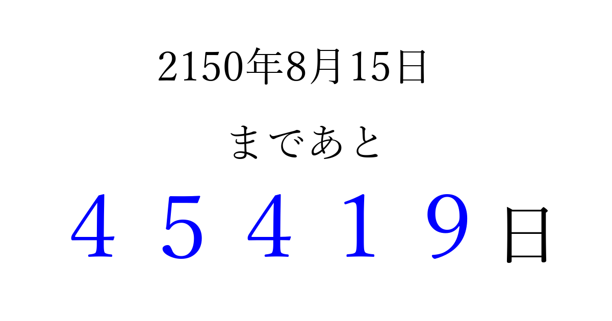 2150年8月15日(土)まで あと 99999 日です 追加すると、トップページからすぐ選べるようになります ※2026/04/08現在の結果です。 最新の状態に更新する ↓シェアして、タイムライン上にカウントダウンを表示しよう!↓ 📤 この結果を共有する Tweet シェア Threads Bluesky 別の日付でカウントダウン 2150年8月のカレンダー このページをブックマークに追加すると、いつでもカウントダウンを確認できます。 (PC: Ctrl+D / Mac: ⌘+D) hitome-notes.comでは以下のページも運営しています。 指定日と期間から日付を計算 | ガチャ確率計算・シミュレーション | プライバシー・ポリシー 運営者:Avocado
