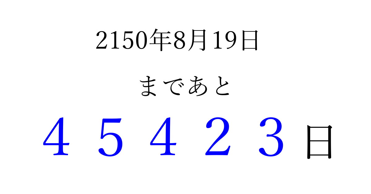 2150年8月19日(水)まで あと 99999 日です 追加すると、トップページからすぐ選べるようになります ※2026/04/08現在の結果です。 最新の状態に更新する ↓シェアして、タイムライン上にカウントダウンを表示しよう!↓ 📤 この結果を共有する Tweet シェア Threads Bluesky 別の日付でカウントダウン 2150年8月のカレンダー このページをブックマークに追加すると、いつでもカウントダウンを確認できます。 (PC: Ctrl+D / Mac: ⌘+D) hitome-notes.comでは以下のページも運営しています。 指定日と期間から日付を計算 | ガチャ確率計算・シミュレーション | プライバシー・ポリシー 運営者:Avocado