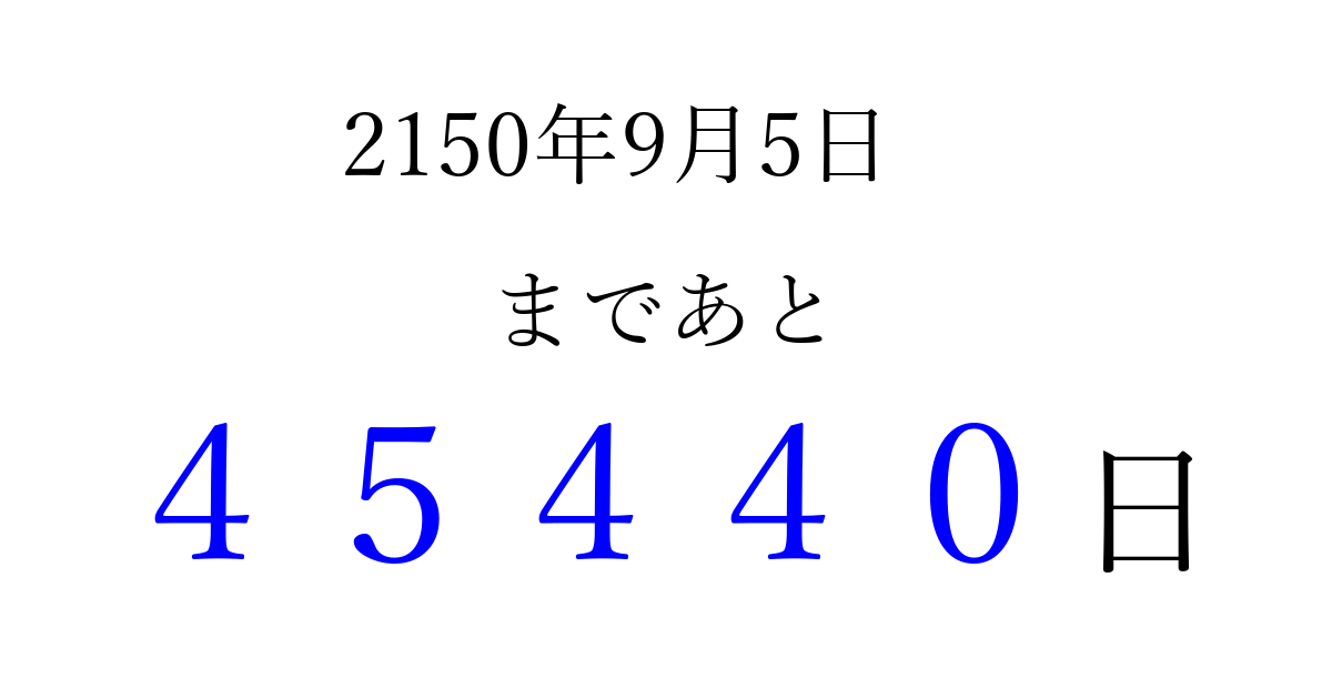 2150年9月5日(土)まで あと 99999 日です 追加すると、トップページからすぐ選べるようになります ※2026/04/08現在の結果です。 最新の状態に更新する ↓シェアして、タイムライン上にカウントダウンを表示しよう!↓ 📤 この結果を共有する Tweet シェア Threads Bluesky 別の日付でカウントダウン 2150年9月のカレンダー このページをブックマークに追加すると、いつでもカウントダウンを確認できます。 (PC: Ctrl+D / Mac: ⌘+D) hitome-notes.comでは以下のページも運営しています。 指定日と期間から日付を計算 | ガチャ確率計算・シミュレーション | プライバシー・ポリシー 運営者:Avocado