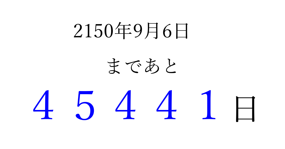 2150年9月6日(日)まで あと 99999 日です 追加すると、トップページからすぐ選べるようになります ※2026/04/08現在の結果です。 最新の状態に更新する ↓シェアして、タイムライン上にカウントダウンを表示しよう!↓ 📤 この結果を共有する Tweet シェア Threads Bluesky 別の日付でカウントダウン 2150年9月のカレンダー このページをブックマークに追加すると、いつでもカウントダウンを確認できます。 (PC: Ctrl+D / Mac: ⌘+D) hitome-notes.comでは以下のページも運営しています。 指定日と期間から日付を計算 | ガチャ確率計算・シミュレーション | プライバシー・ポリシー 運営者:Avocado