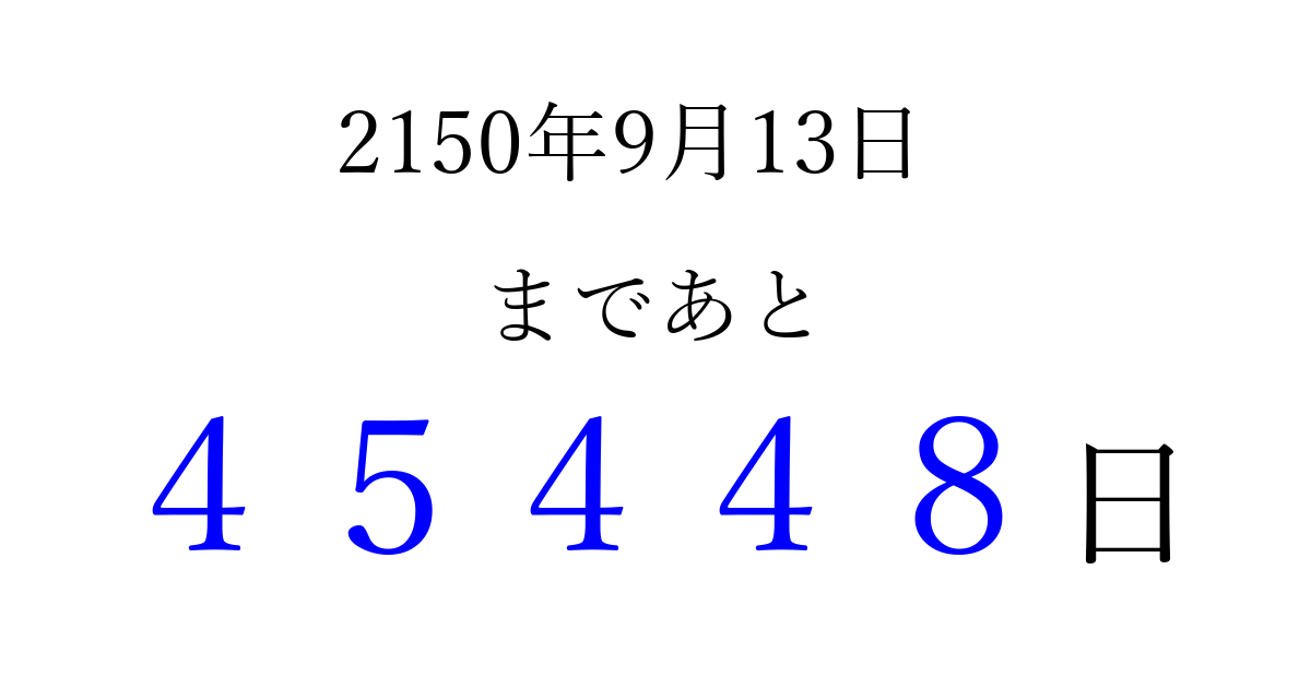 2150年9月13日(日)まで あと 99999 日です 追加すると、トップページからすぐ選べるようになります ※2026/04/08現在の結果です。 最新の状態に更新する ↓シェアして、タイムライン上にカウントダウンを表示しよう!↓ 📤 この結果を共有する Tweet シェア Threads Bluesky 別の日付でカウントダウン 2150年9月のカレンダー このページをブックマークに追加すると、いつでもカウントダウンを確認できます。 (PC: Ctrl+D / Mac: ⌘+D) hitome-notes.comでは以下のページも運営しています。 指定日と期間から日付を計算 | ガチャ確率計算・シミュレーション | プライバシー・ポリシー 運営者:Avocado