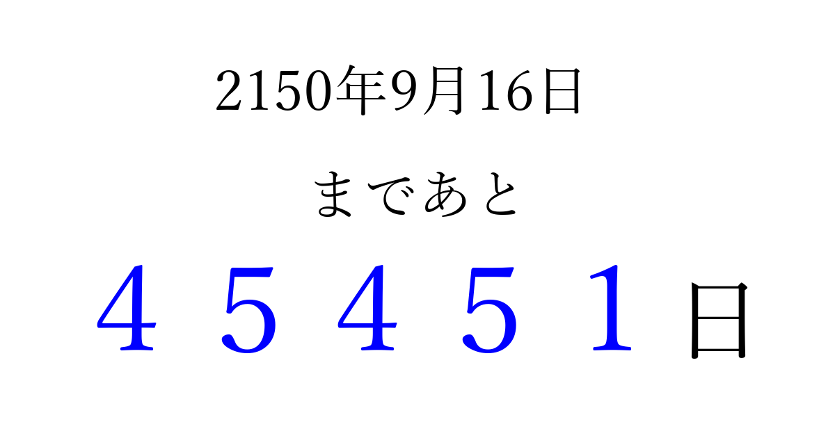 2150年9月16日(水)まで あと 99999 日です 追加すると、トップページからすぐ選べるようになります ※2026/04/08現在の結果です。 最新の状態に更新する ↓シェアして、タイムライン上にカウントダウンを表示しよう!↓ 📤 この結果を共有する Tweet シェア Threads Bluesky 別の日付でカウントダウン 2150年9月のカレンダー このページをブックマークに追加すると、いつでもカウントダウンを確認できます。 (PC: Ctrl+D / Mac: ⌘+D) hitome-notes.comでは以下のページも運営しています。 指定日と期間から日付を計算 | ガチャ確率計算・シミュレーション | プライバシー・ポリシー 運営者:Avocado