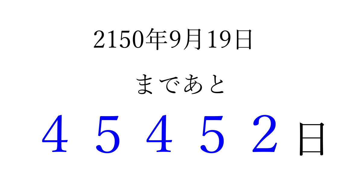 2150年9月19日(土)まで あと 99999 日です 追加すると、トップページからすぐ選べるようになります ※2026/04/10現在の結果です。 最新の状態に更新する ↓シェアして、タイムライン上にカウントダウンを表示しよう!↓ 📤 この結果を共有する Tweet シェア Threads Bluesky 別の日付でカウントダウン 2150年9月のカレンダー このページをブックマークに追加すると、いつでもカウントダウンを確認できます。 (PC: Ctrl+D / Mac: ⌘+D) hitome-notes.comでは以下のページも運営しています。 指定日と期間から日付を計算 | ガチャ確率計算・シミュレーション | プライバシー・ポリシー 運営者:Avocado