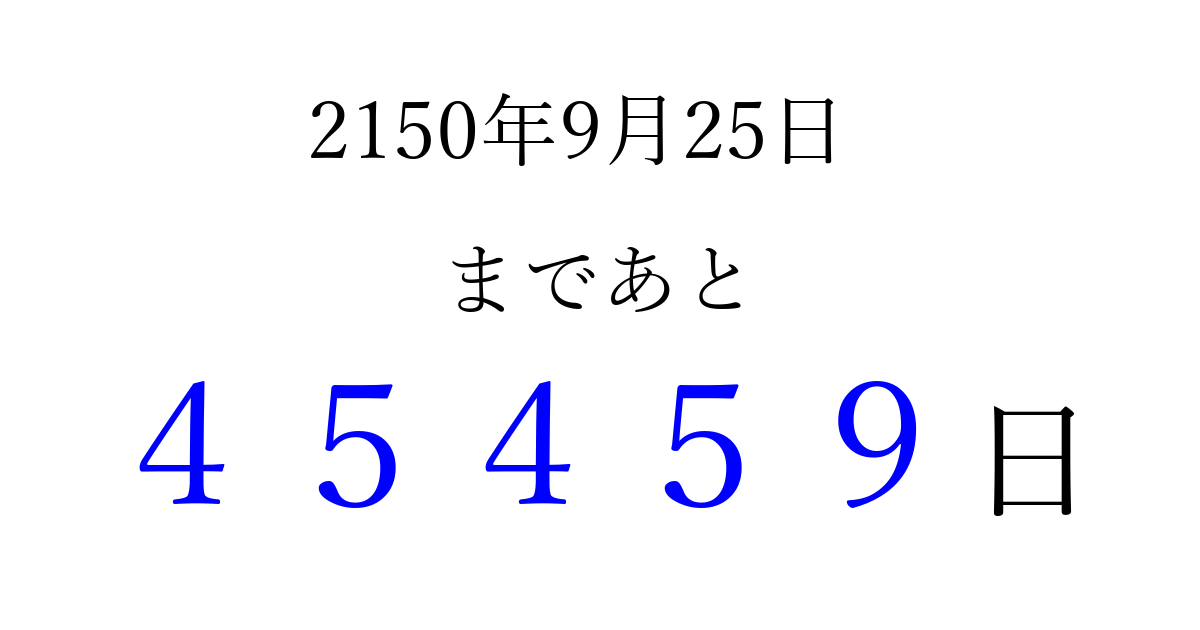 2150年9月25日(金)まで あと 99999 日です 追加すると、トップページからすぐ選べるようになります ※2026/04/09現在の結果です。 最新の状態に更新する ↓シェアして、タイムライン上にカウントダウンを表示しよう!↓ 📤 この結果を共有する Tweet シェア Threads Bluesky 別の日付でカウントダウン 2150年9月のカレンダー このページをブックマークに追加すると、いつでもカウントダウンを確認できます。 (PC: Ctrl+D / Mac: ⌘+D) hitome-notes.comでは以下のページも運営しています。 指定日と期間から日付を計算 | ガチャ確率計算・シミュレーション | プライバシー・ポリシー 運営者:Avocado