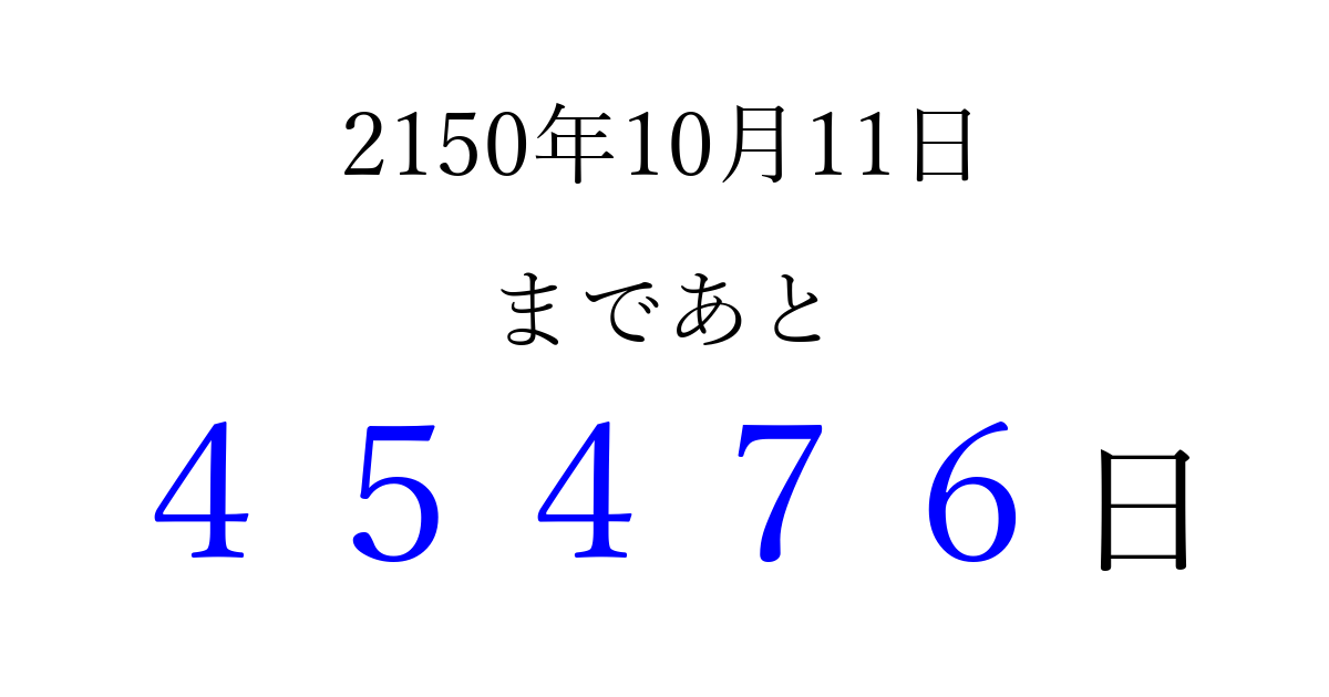2150年10月11日(日)まで あと 99999 日です 追加すると、トップページからすぐ選べるようになります ※2026/04/08現在の結果です。 最新の状態に更新する ↓シェアして、タイムライン上にカウントダウンを表示しよう!↓ 📤 この結果を共有する Tweet シェア Threads Bluesky 別の日付でカウントダウン 2150年10月のカレンダー このページをブックマークに追加すると、いつでもカウントダウンを確認できます。 (PC: Ctrl+D / Mac: ⌘+D) hitome-notes.comでは以下のページも運営しています。 指定日と期間から日付を計算 | ガチャ確率計算・シミュレーション | プライバシー・ポリシー 運営者:Avocado