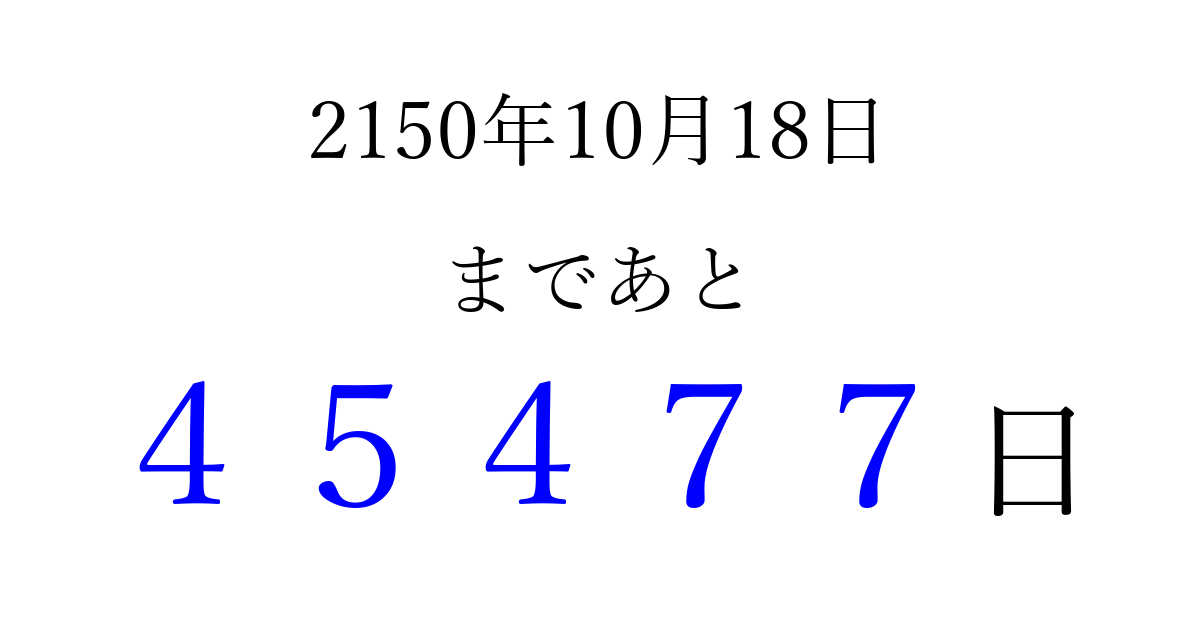 2150年10月18日(日)まで あと 99999 日です 追加すると、トップページからすぐ選べるようになります ※2026/04/14現在の結果です。 最新の状態に更新する ↓シェアして、タイムライン上にカウントダウンを表示しよう!↓ 📤 この結果を共有する Tweet シェア Threads Bluesky 別の日付でカウントダウン 2150年10月のカレンダー このページをブックマークに追加すると、いつでもカウントダウンを確認できます。 (PC: Ctrl+D / Mac: ⌘+D) hitome-notes.comでは以下のページも運営しています。 指定日と期間から日付を計算 | ガチャ確率計算・シミュレーション | プライバシー・ポリシー 運営者:Avocado