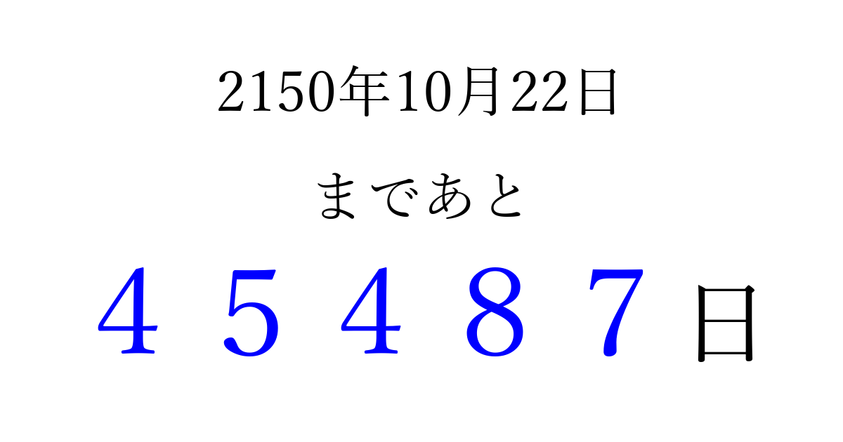 2150年10月22日(木)まで あと 99999 日です 追加すると、トップページからすぐ選べるようになります ※2026/04/08現在の結果です。 最新の状態に更新する ↓シェアして、タイムライン上にカウントダウンを表示しよう!↓ 📤 この結果を共有する Tweet シェア Threads Bluesky 別の日付でカウントダウン 2150年10月のカレンダー このページをブックマークに追加すると、いつでもカウントダウンを確認できます。 (PC: Ctrl+D / Mac: ⌘+D) hitome-notes.comでは以下のページも運営しています。 指定日と期間から日付を計算 | ガチャ確率計算・シミュレーション | プライバシー・ポリシー 運営者:Avocado