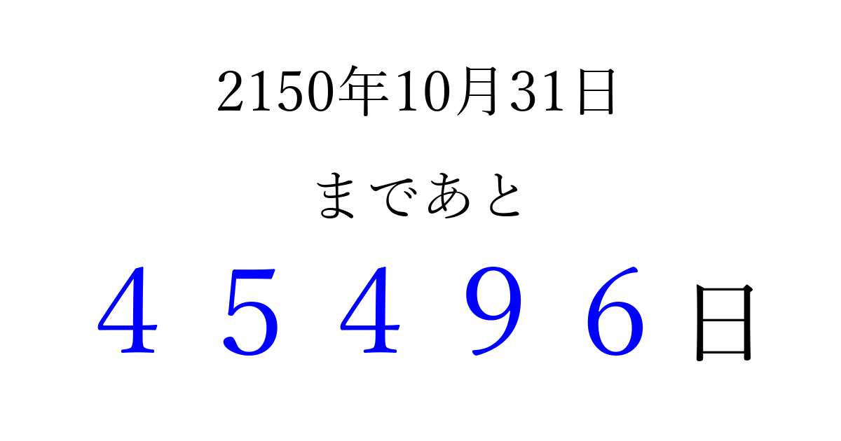 2150年10月31日(土)まで あと 99999 日です 追加すると、トップページからすぐ選べるようになります ※2026/04/08現在の結果です。 最新の状態に更新する ↓シェアして、タイムライン上にカウントダウンを表示しよう!↓ 📤 この結果を共有する Tweet シェア Threads Bluesky 別の日付でカウントダウン 2150年10月のカレンダー このページをブックマークに追加すると、いつでもカウントダウンを確認できます。 (PC: Ctrl+D / Mac: ⌘+D) hitome-notes.comでは以下のページも運営しています。 指定日と期間から日付を計算 | ガチャ確率計算・シミュレーション | プライバシー・ポリシー 運営者:Avocado