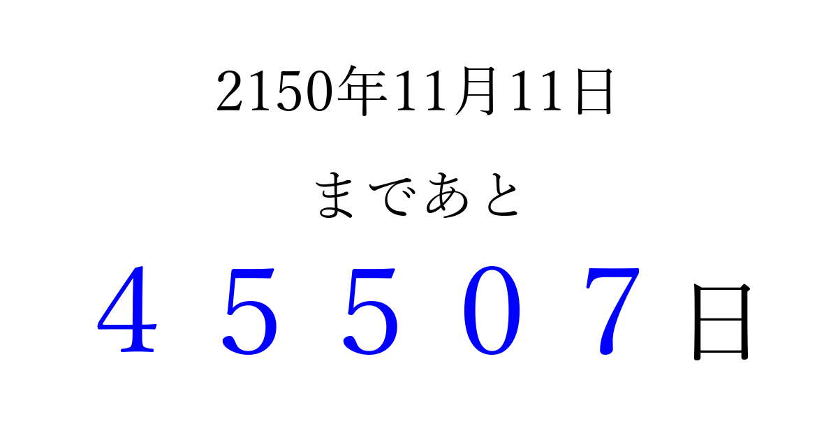 2150年11月11日(水)まで あと 99999 日です 追加すると、トップページからすぐ選べるようになります ※2026/04/08現在の結果です。 最新の状態に更新する ↓シェアして、タイムライン上にカウントダウンを表示しよう!↓ 📤 この結果を共有する Tweet シェア Threads Bluesky 別の日付でカウントダウン 2150年11月のカレンダー このページをブックマークに追加すると、いつでもカウントダウンを確認できます。 (PC: Ctrl+D / Mac: ⌘+D) hitome-notes.comでは以下のページも運営しています。 指定日と期間から日付を計算 | ガチャ確率計算・シミュレーション | プライバシー・ポリシー 運営者:Avocado