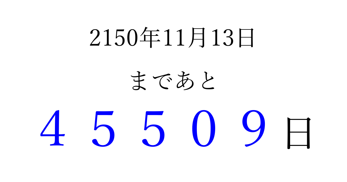 2150年11月13日(金)まで あと 99999 日です 追加すると、トップページからすぐ選べるようになります ※2026/04/08現在の結果です。 最新の状態に更新する ↓シェアして、タイムライン上にカウントダウンを表示しよう!↓ 📤 この結果を共有する Tweet シェア Threads Bluesky 別の日付でカウントダウン 2150年11月のカレンダー このページをブックマークに追加すると、いつでもカウントダウンを確認できます。 (PC: Ctrl+D / Mac: ⌘+D) hitome-notes.comでは以下のページも運営しています。 指定日と期間から日付を計算 | ガチャ確率計算・シミュレーション | プライバシー・ポリシー 運営者:Avocado