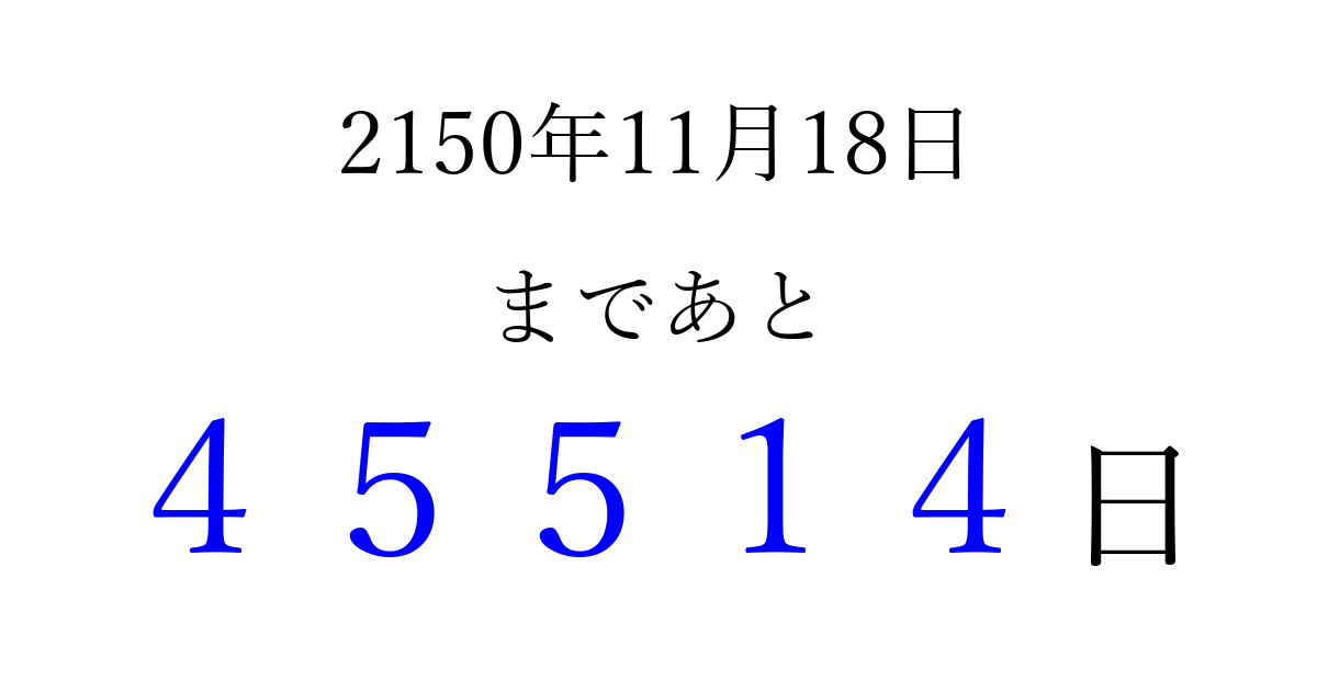 2150年11月18日(水)まで あと 99999 日です 追加すると、トップページからすぐ選べるようになります ※2026/04/08現在の結果です。 最新の状態に更新する ↓シェアして、タイムライン上にカウントダウンを表示しよう!↓ 📤 この結果を共有する Tweet シェア Threads Bluesky 別の日付でカウントダウン 2150年11月のカレンダー このページをブックマークに追加すると、いつでもカウントダウンを確認できます。 (PC: Ctrl+D / Mac: ⌘+D) hitome-notes.comでは以下のページも運営しています。 指定日と期間から日付を計算 | ガチャ確率計算・シミュレーション | プライバシー・ポリシー 運営者:Avocado