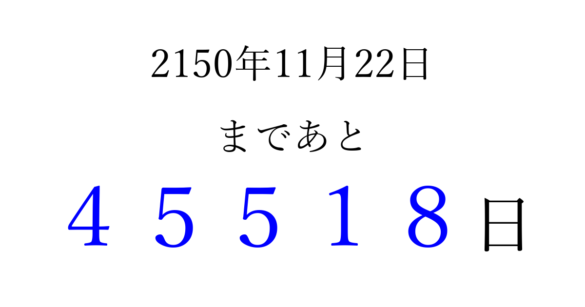 2150年11月22日(日)まで あと 99999 日です 追加すると、トップページからすぐ選べるようになります ※2026/04/08現在の結果です。 最新の状態に更新する ↓シェアして、タイムライン上にカウントダウンを表示しよう!↓ 📤 この結果を共有する Tweet シェア Threads Bluesky 別の日付でカウントダウン 2150年11月のカレンダー このページをブックマークに追加すると、いつでもカウントダウンを確認できます。 (PC: Ctrl+D / Mac: ⌘+D) hitome-notes.comでは以下のページも運営しています。 指定日と期間から日付を計算 | ガチャ確率計算・シミュレーション | プライバシー・ポリシー 運営者:Avocado