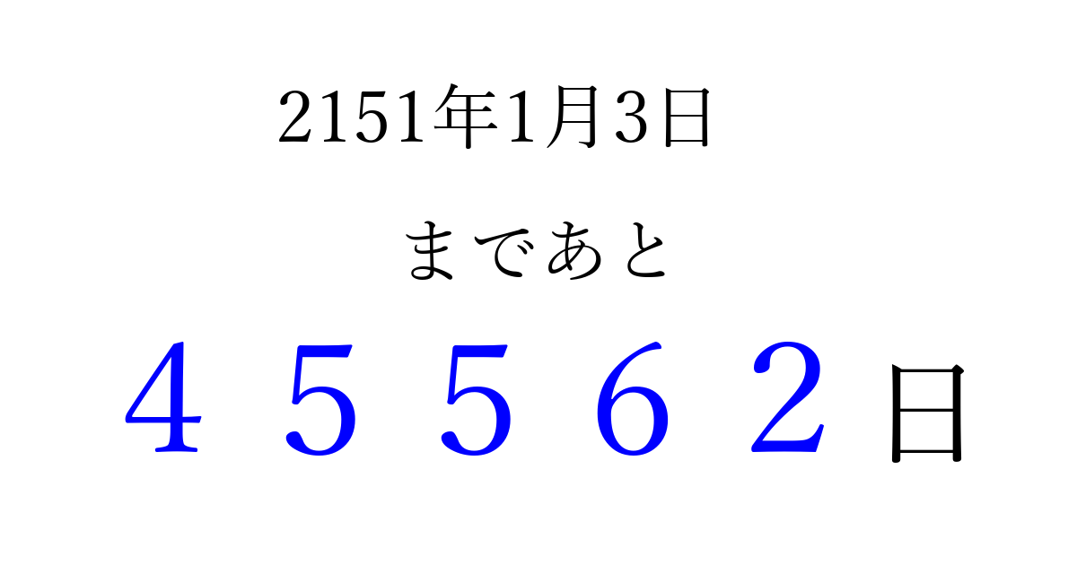 2151年1月3日(日)まで あと 99999 日です 追加すると、トップページからすぐ選べるようになります ※2026/04/06現在の結果です。 最新の状態に更新する ↓シェアして、タイムライン上にカウントダウンを表示しよう!↓ 📤 この結果を共有する Tweet シェア Threads Bluesky 別の日付でカウントダウン 2151年1月のカレンダー このページをブックマークに追加すると、いつでもカウントダウンを確認できます。 (PC: Ctrl+D / Mac: ⌘+D) hitome-notes.comでは以下のページも運営しています。 指定日と期間から日付を計算 | ガチャ確率計算・シミュレーション | プライバシー・ポリシー 運営者:Avocado