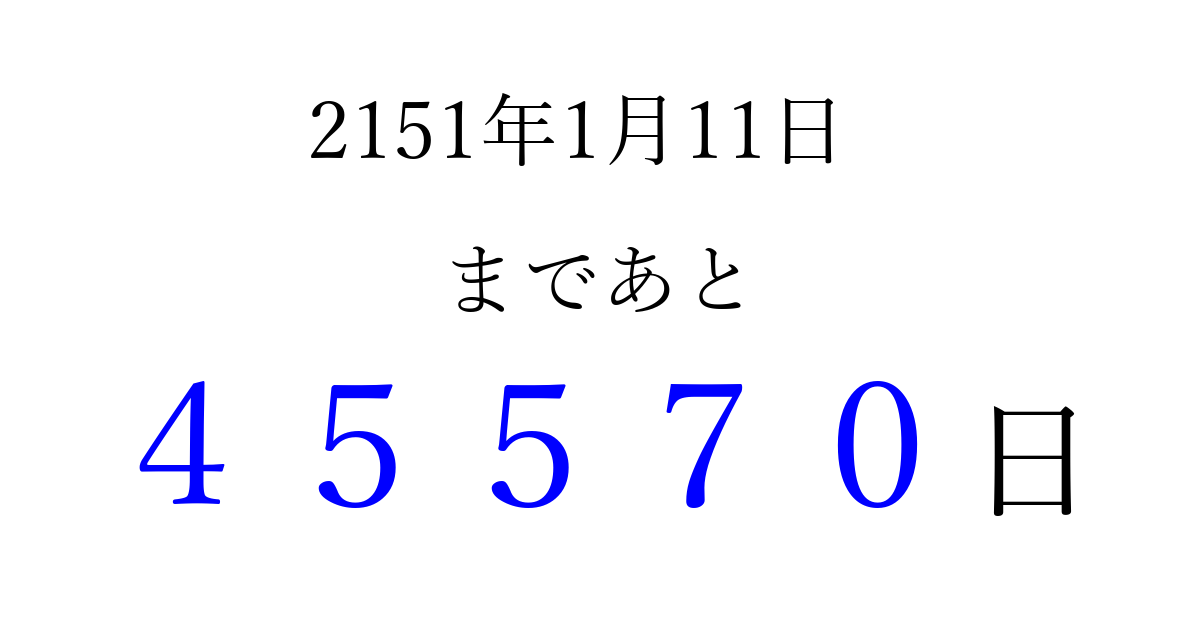 2151年1月11日(月)まで あと 99999 日です 追加すると、トップページからすぐ選べるようになります ※2026/04/06現在の結果です。 最新の状態に更新する ↓シェアして、タイムライン上にカウントダウンを表示しよう!↓ 📤 この結果を共有する Tweet シェア Threads Bluesky 別の日付でカウントダウン 2151年1月のカレンダー このページをブックマークに追加すると、いつでもカウントダウンを確認できます。 (PC: Ctrl+D / Mac: ⌘+D) hitome-notes.comでは以下のページも運営しています。 指定日と期間から日付を計算 | ガチャ確率計算・シミュレーション | プライバシー・ポリシー 運営者:Avocado