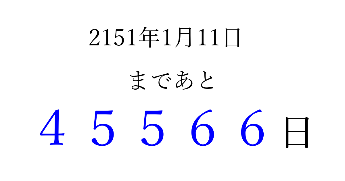 2151年1月11日(月)まで あと 99999 日です 追加すると、トップページからすぐ選べるようになります ※2026/04/10現在の結果です。 最新の状態に更新する ↓シェアして、タイムライン上にカウントダウンを表示しよう!↓ 📤 この結果を共有する Tweet シェア Threads Bluesky 別の日付でカウントダウン 2151年1月のカレンダー このページをブックマークに追加すると、いつでもカウントダウンを確認できます。 (PC: Ctrl+D / Mac: ⌘+D) hitome-notes.comでは以下のページも運営しています。 指定日と期間から日付を計算 | ガチャ確率計算・シミュレーション | プライバシー・ポリシー 運営者:Avocado