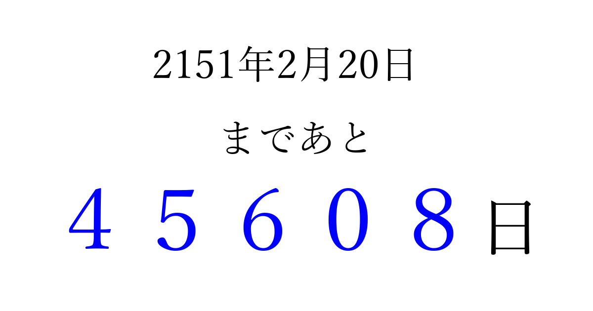 2151年2月20日(土)まで あと 99999 日です 追加すると、トップページからすぐ選べるようになります ※2026/04/08現在の結果です。 最新の状態に更新する ↓シェアして、タイムライン上にカウントダウンを表示しよう!↓ 📤 この結果を共有する Tweet シェア Threads Bluesky 別の日付でカウントダウン 2151年2月のカレンダー このページをブックマークに追加すると、いつでもカウントダウンを確認できます。 (PC: Ctrl+D / Mac: ⌘+D) hitome-notes.comでは以下のページも運営しています。 指定日と期間から日付を計算 | ガチャ確率計算・シミュレーション | プライバシー・ポリシー 運営者:Avocado