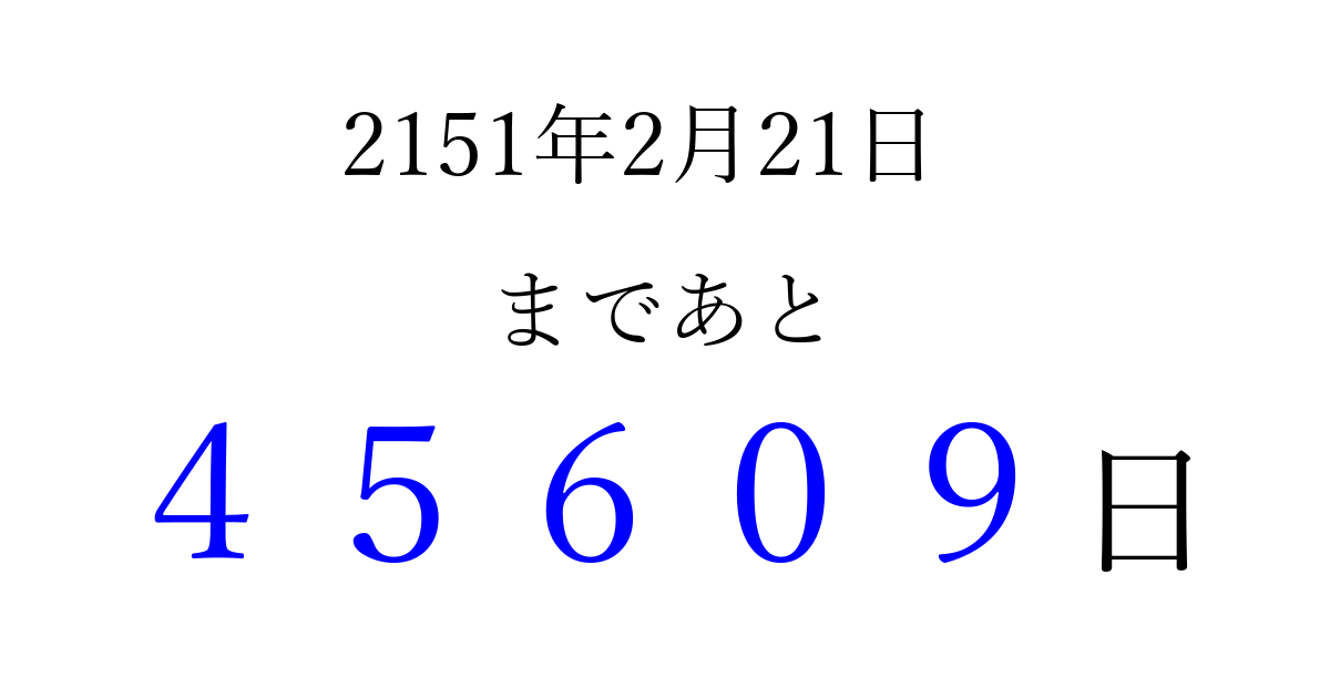 2151年2月21日(日)まで あと 99999 日です 追加すると、トップページからすぐ選べるようになります ※2026/04/08現在の結果です。 最新の状態に更新する ↓シェアして、タイムライン上にカウントダウンを表示しよう!↓ 📤 この結果を共有する Tweet シェア Threads Bluesky 別の日付でカウントダウン 2151年2月のカレンダー このページをブックマークに追加すると、いつでもカウントダウンを確認できます。 (PC: Ctrl+D / Mac: ⌘+D) hitome-notes.comでは以下のページも運営しています。 指定日と期間から日付を計算 | ガチャ確率計算・シミュレーション | プライバシー・ポリシー 運営者:Avocado
