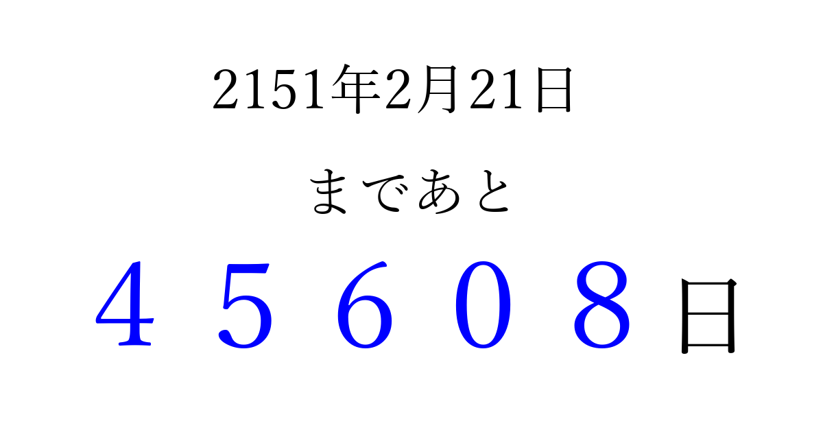2151年2月21日(日)まで あと 99999 日です 追加すると、トップページからすぐ選べるようになります ※2026/04/09現在の結果です。 最新の状態に更新する ↓シェアして、タイムライン上にカウントダウンを表示しよう!↓ 📤 この結果を共有する Tweet シェア Threads Bluesky 別の日付でカウントダウン 2151年2月のカレンダー このページをブックマークに追加すると、いつでもカウントダウンを確認できます。 (PC: Ctrl+D / Mac: ⌘+D) hitome-notes.comでは以下のページも運営しています。 指定日と期間から日付を計算 | ガチャ確率計算・シミュレーション | プライバシー・ポリシー 運営者:Avocado