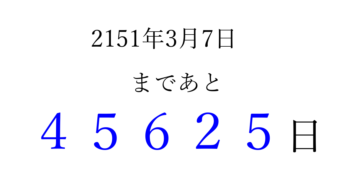 2151年3月7日(日)まで あと 99999 日です 追加すると、トップページからすぐ選べるようになります ※2026/04/06現在の結果です。 最新の状態に更新する ↓シェアして、タイムライン上にカウントダウンを表示しよう!↓ 📤 この結果を共有する Tweet シェア Threads Bluesky 別の日付でカウントダウン 2151年3月のカレンダー このページをブックマークに追加すると、いつでもカウントダウンを確認できます。 (PC: Ctrl+D / Mac: ⌘+D) hitome-notes.comでは以下のページも運営しています。 指定日と期間から日付を計算 | ガチャ確率計算・シミュレーション | プライバシー・ポリシー 運営者:Avocado