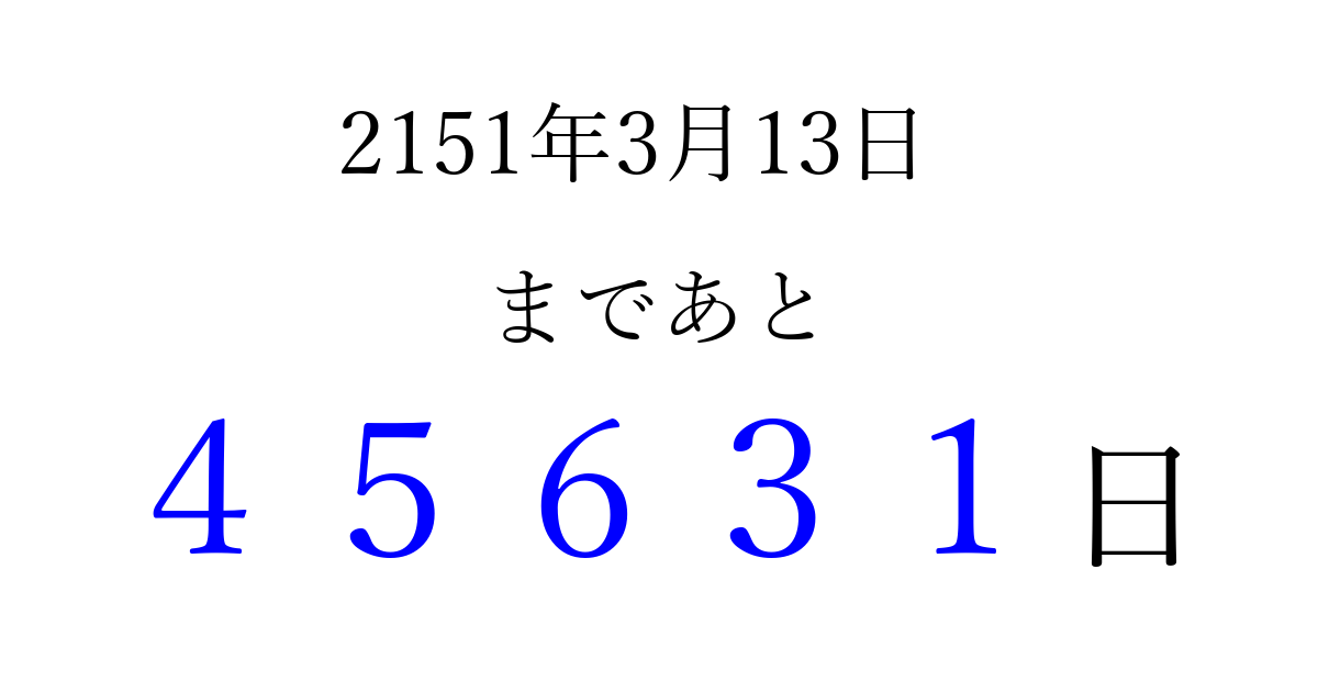 2151年3月13日(土)まで あと 99999 日です 追加すると、トップページからすぐ選べるようになります ※2026/04/06現在の結果です。 最新の状態に更新する ↓シェアして、タイムライン上にカウントダウンを表示しよう!↓ 📤 この結果を共有する Tweet シェア Threads Bluesky 別の日付でカウントダウン 2151年3月のカレンダー このページをブックマークに追加すると、いつでもカウントダウンを確認できます。 (PC: Ctrl+D / Mac: ⌘+D) hitome-notes.comでは以下のページも運営しています。 指定日と期間から日付を計算 | ガチャ確率計算・シミュレーション | プライバシー・ポリシー 運営者:Avocado