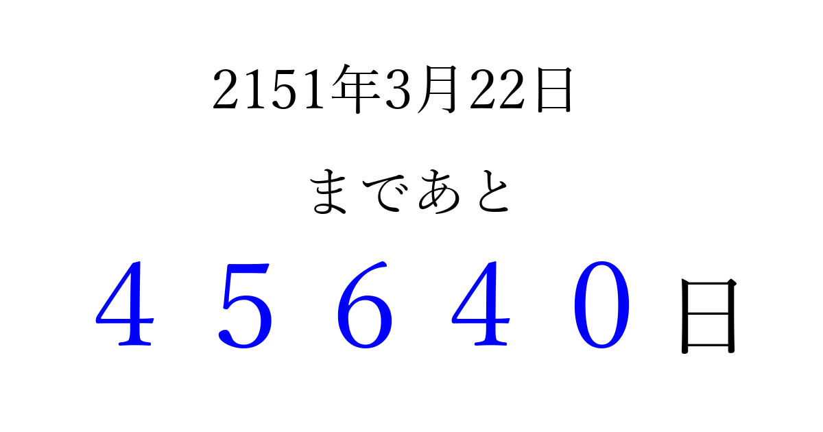 2151年3月22日(月)まで あと 99999 日です 追加すると、トップページからすぐ選べるようになります ※2026/04/06現在の結果です。 最新の状態に更新する ↓シェアして、タイムライン上にカウントダウンを表示しよう!↓ 📤 この結果を共有する Tweet シェア Threads Bluesky 別の日付でカウントダウン 2151年3月のカレンダー このページをブックマークに追加すると、いつでもカウントダウンを確認できます。 (PC: Ctrl+D / Mac: ⌘+D) hitome-notes.comでは以下のページも運営しています。 指定日と期間から日付を計算 | ガチャ確率計算・シミュレーション | プライバシー・ポリシー 運営者:Avocado