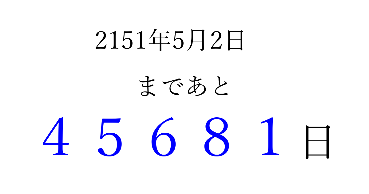 2151年5月2日(日)まで あと 99999 日です 追加すると、トップページからすぐ選べるようになります ※2026/04/06現在の結果です。 最新の状態に更新する ↓シェアして、タイムライン上にカウントダウンを表示しよう!↓ 📤 この結果を共有する Tweet シェア Threads Bluesky 別の日付でカウントダウン 2151年5月のカレンダー このページをブックマークに追加すると、いつでもカウントダウンを確認できます。 (PC: Ctrl+D / Mac: ⌘+D) hitome-notes.comでは以下のページも運営しています。 指定日と期間から日付を計算 | ガチャ確率計算・シミュレーション | プライバシー・ポリシー 運営者:Avocado