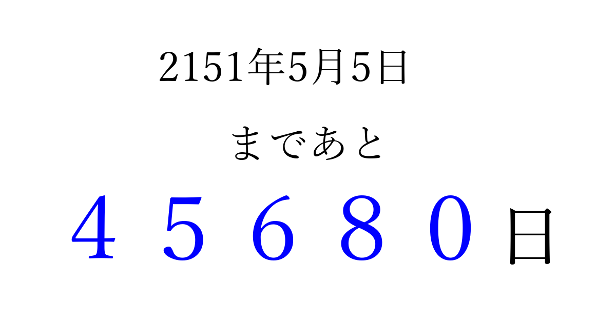 2151年5月5日(水)まで あと 99999 日です 追加すると、トップページからすぐ選べるようになります ※2026/04/10現在の結果です。 最新の状態に更新する ↓シェアして、タイムライン上にカウントダウンを表示しよう!↓ 📤 この結果を共有する Tweet シェア Threads Bluesky 別の日付でカウントダウン 2151年5月のカレンダー このページをブックマークに追加すると、いつでもカウントダウンを確認できます。 (PC: Ctrl+D / Mac: ⌘+D) hitome-notes.comでは以下のページも運営しています。 指定日と期間から日付を計算 | ガチャ確率計算・シミュレーション | プライバシー・ポリシー 運営者:Avocado