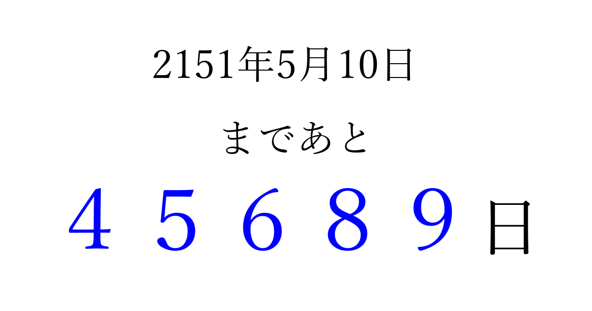 2151年5月10日(月)まで あと 99999 日です 追加すると、トップページからすぐ選べるようになります ※2026/04/06現在の結果です。 最新の状態に更新する ↓シェアして、タイムライン上にカウントダウンを表示しよう!↓ 📤 この結果を共有する Tweet シェア Threads Bluesky 別の日付でカウントダウン 2151年5月のカレンダー このページをブックマークに追加すると、いつでもカウントダウンを確認できます。 (PC: Ctrl+D / Mac: ⌘+D) hitome-notes.comでは以下のページも運営しています。 指定日と期間から日付を計算 | ガチャ確率計算・シミュレーション | プライバシー・ポリシー 運営者:Avocado