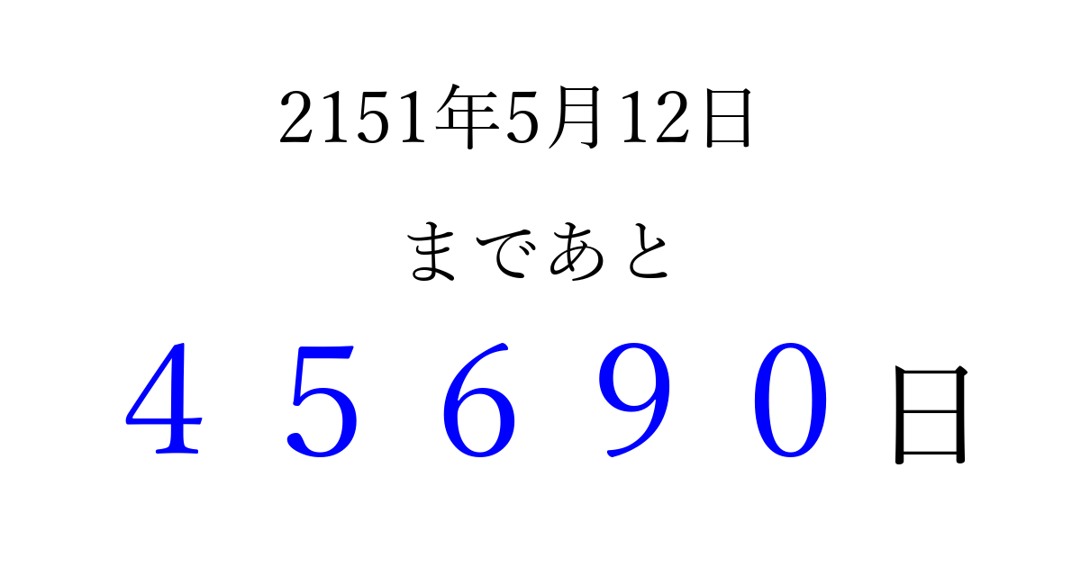 2151年5月12日(水)まで あと 99999 日です 追加すると、トップページからすぐ選べるようになります ※2026/04/07現在の結果です。 最新の状態に更新する ↓シェアして、タイムライン上にカウントダウンを表示しよう!↓ 📤 この結果を共有する Tweet シェア Threads Bluesky 別の日付でカウントダウン 2151年5月のカレンダー このページをブックマークに追加すると、いつでもカウントダウンを確認できます。 (PC: Ctrl+D / Mac: ⌘+D) hitome-notes.comでは以下のページも運営しています。 指定日と期間から日付を計算 | ガチャ確率計算・シミュレーション | プライバシー・ポリシー 運営者:Avocado