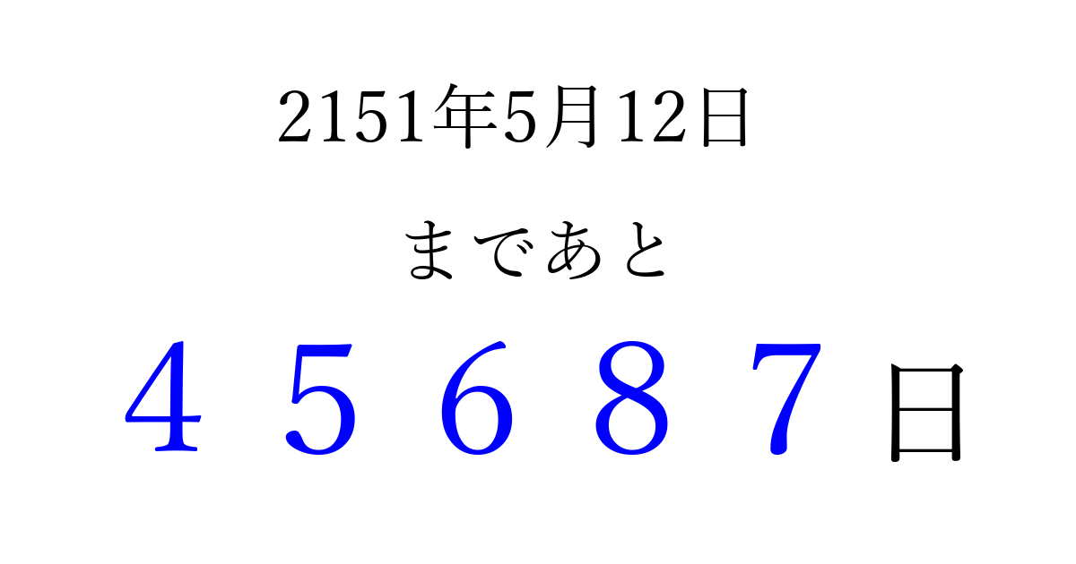 2151年5月12日(水)まで あと 99999 日です 追加すると、トップページからすぐ選べるようになります ※2026/04/10現在の結果です。 最新の状態に更新する ↓シェアして、タイムライン上にカウントダウンを表示しよう!↓ 📤 この結果を共有する Tweet シェア Threads Bluesky 別の日付でカウントダウン 2151年5月のカレンダー このページをブックマークに追加すると、いつでもカウントダウンを確認できます。 (PC: Ctrl+D / Mac: ⌘+D) hitome-notes.comでは以下のページも運営しています。 指定日と期間から日付を計算 | ガチャ確率計算・シミュレーション | プライバシー・ポリシー 運営者:Avocado