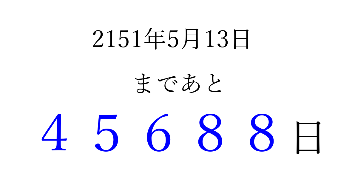 2151年5月13日(木)まで あと 99999 日です 追加すると、トップページからすぐ選べるようになります ※2026/04/10現在の結果です。 最新の状態に更新する ↓シェアして、タイムライン上にカウントダウンを表示しよう!↓ 📤 この結果を共有する Tweet シェア Threads Bluesky 別の日付でカウントダウン 2151年5月のカレンダー このページをブックマークに追加すると、いつでもカウントダウンを確認できます。 (PC: Ctrl+D / Mac: ⌘+D) hitome-notes.comでは以下のページも運営しています。 指定日と期間から日付を計算 | ガチャ確率計算・シミュレーション | プライバシー・ポリシー 運営者:Avocado