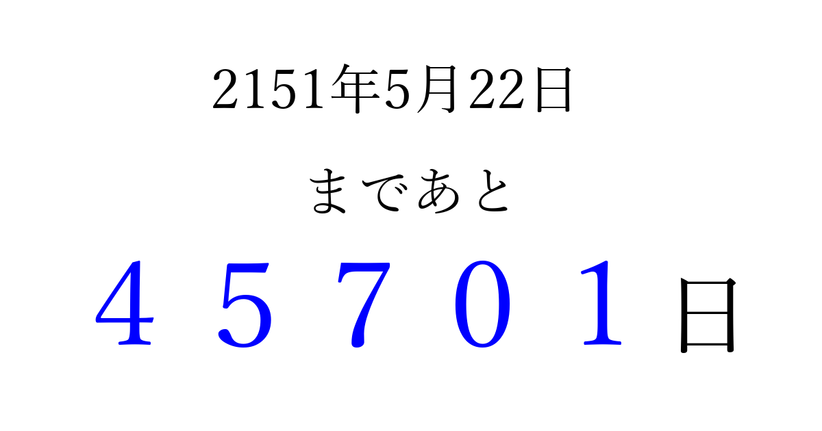 2151年5月22日(土)まで あと 99999 日です 追加すると、トップページからすぐ選べるようになります ※2026/04/06現在の結果です。 最新の状態に更新する ↓シェアして、タイムライン上にカウントダウンを表示しよう!↓ 📤 この結果を共有する Tweet シェア Threads Bluesky 別の日付でカウントダウン 2151年5月のカレンダー このページをブックマークに追加すると、いつでもカウントダウンを確認できます。 (PC: Ctrl+D / Mac: ⌘+D) hitome-notes.comでは以下のページも運営しています。 指定日と期間から日付を計算 | ガチャ確率計算・シミュレーション | プライバシー・ポリシー 運営者:Avocado