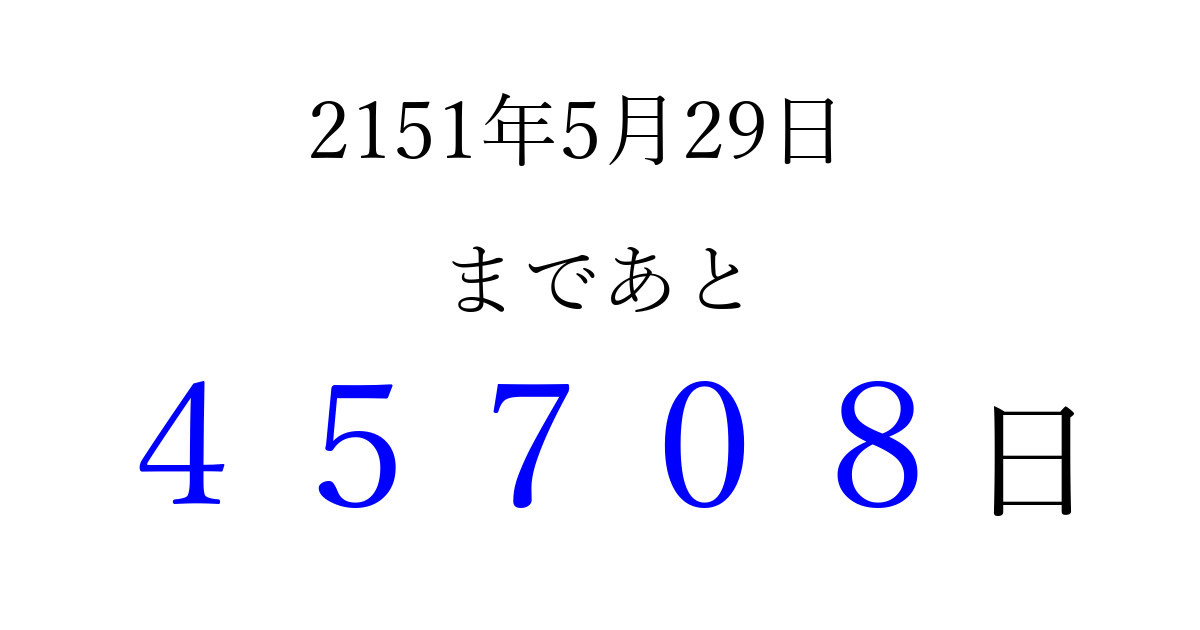 2151年5月29日(土)まで あと 99999 日です 追加すると、トップページからすぐ選べるようになります ※2026/04/06現在の結果です。 最新の状態に更新する ↓シェアして、タイムライン上にカウントダウンを表示しよう!↓ 📤 この結果を共有する Tweet シェア Threads Bluesky 別の日付でカウントダウン 2151年5月のカレンダー このページをブックマークに追加すると、いつでもカウントダウンを確認できます。 (PC: Ctrl+D / Mac: ⌘+D) hitome-notes.comでは以下のページも運営しています。 指定日と期間から日付を計算 | ガチャ確率計算・シミュレーション | プライバシー・ポリシー 運営者:Avocado