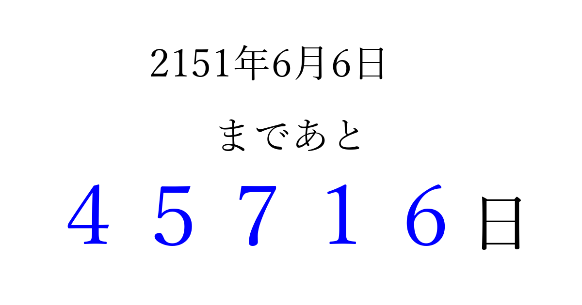 2151年6月6日(日)まで あと 99999 日です 追加すると、トップページからすぐ選べるようになります ※2026/04/06現在の結果です。 最新の状態に更新する ↓シェアして、タイムライン上にカウントダウンを表示しよう!↓ 📤 この結果を共有する Tweet シェア Threads Bluesky 別の日付でカウントダウン 2151年6月のカレンダー このページをブックマークに追加すると、いつでもカウントダウンを確認できます。 (PC: Ctrl+D / Mac: ⌘+D) hitome-notes.comでは以下のページも運営しています。 指定日と期間から日付を計算 | ガチャ確率計算・シミュレーション | プライバシー・ポリシー 運営者:Avocado