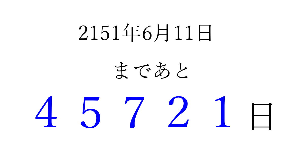 2151年6月11日(金)まで あと 99999 日です 追加すると、トップページからすぐ選べるようになります ※2026/04/06現在の結果です。 最新の状態に更新する ↓シェアして、タイムライン上にカウントダウンを表示しよう!↓ 📤 この結果を共有する Tweet シェア Threads Bluesky 別の日付でカウントダウン 2151年6月のカレンダー このページをブックマークに追加すると、いつでもカウントダウンを確認できます。 (PC: Ctrl+D / Mac: ⌘+D) hitome-notes.comでは以下のページも運営しています。 指定日と期間から日付を計算 | ガチャ確率計算・シミュレーション | プライバシー・ポリシー 運営者:Avocado