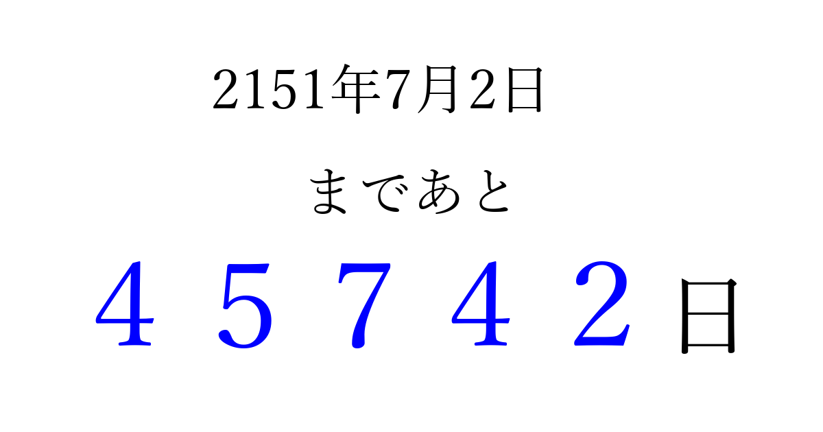 2151年7月2日(金)まで あと 99999 日です 追加すると、トップページからすぐ選べるようになります ※2026/04/06現在の結果です。 最新の状態に更新する ↓シェアして、タイムライン上にカウントダウンを表示しよう!↓ 📤 この結果を共有する Tweet シェア Threads Bluesky 別の日付でカウントダウン 2151年7月のカレンダー このページをブックマークに追加すると、いつでもカウントダウンを確認できます。 (PC: Ctrl+D / Mac: ⌘+D) hitome-notes.comでは以下のページも運営しています。 指定日と期間から日付を計算 | ガチャ確率計算・シミュレーション | プライバシー・ポリシー 運営者:Avocado