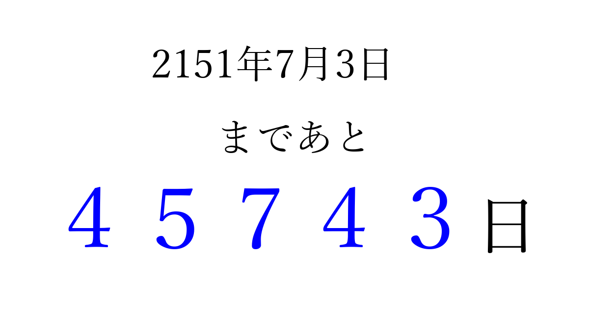 2151年7月3日(土)まで あと 99999 日です 追加すると、トップページからすぐ選べるようになります ※2026/04/06現在の結果です。 最新の状態に更新する ↓シェアして、タイムライン上にカウントダウンを表示しよう!↓ 📤 この結果を共有する Tweet シェア Threads Bluesky 別の日付でカウントダウン 2151年7月のカレンダー このページをブックマークに追加すると、いつでもカウントダウンを確認できます。 (PC: Ctrl+D / Mac: ⌘+D) hitome-notes.comでは以下のページも運営しています。 指定日と期間から日付を計算 | ガチャ確率計算・シミュレーション | プライバシー・ポリシー 運営者:Avocado