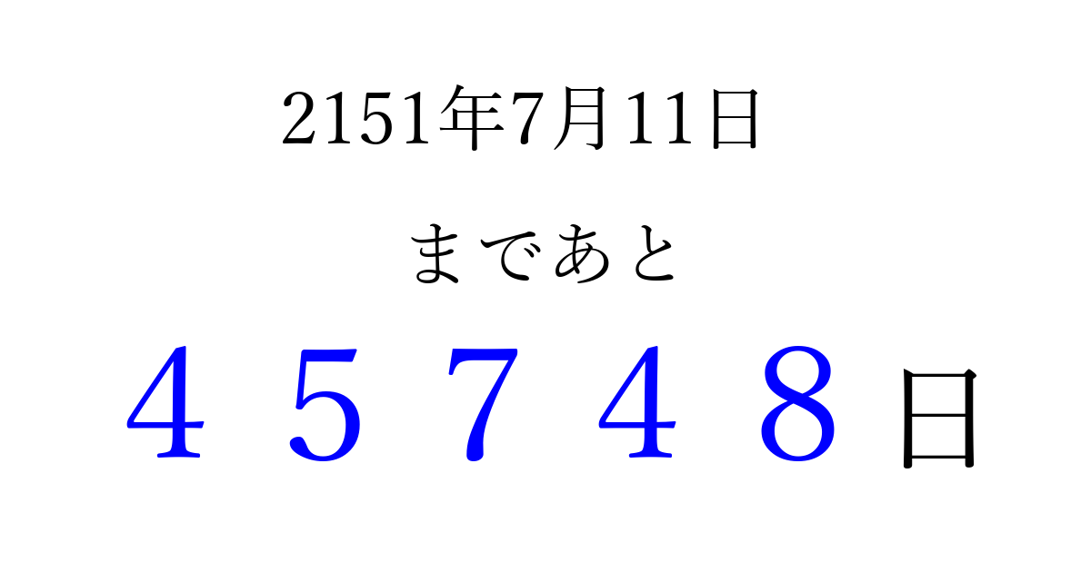 2151年7月11日(日)まで あと 99999 日です 追加すると、トップページからすぐ選べるようになります ※2026/04/09現在の結果です。 最新の状態に更新する ↓シェアして、タイムライン上にカウントダウンを表示しよう!↓ 📤 この結果を共有する Tweet シェア Threads Bluesky 別の日付でカウントダウン 2151年7月のカレンダー このページをブックマークに追加すると、いつでもカウントダウンを確認できます。 (PC: Ctrl+D / Mac: ⌘+D) hitome-notes.comでは以下のページも運営しています。 指定日と期間から日付を計算 | ガチャ確率計算・シミュレーション | プライバシー・ポリシー 運営者:Avocado