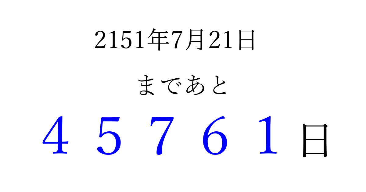 2151年7月21日(水)まで あと 99999 日です 追加すると、トップページからすぐ選べるようになります ※2026/04/06現在の結果です。 最新の状態に更新する ↓シェアして、タイムライン上にカウントダウンを表示しよう!↓ 📤 この結果を共有する Tweet シェア Threads Bluesky 別の日付でカウントダウン 2151年7月のカレンダー このページをブックマークに追加すると、いつでもカウントダウンを確認できます。 (PC: Ctrl+D / Mac: ⌘+D) hitome-notes.comでは以下のページも運営しています。 指定日と期間から日付を計算 | ガチャ確率計算・シミュレーション | プライバシー・ポリシー 運営者:Avocado