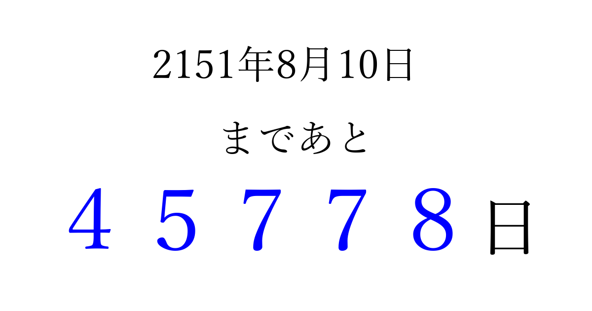 2151年8月10日(火)まで あと 99999 日です 追加すると、トップページからすぐ選べるようになります ※2026/04/09現在の結果です。 最新の状態に更新する ↓シェアして、タイムライン上にカウントダウンを表示しよう!↓ 📤 この結果を共有する Tweet シェア Threads Bluesky 別の日付でカウントダウン 2151年8月のカレンダー このページをブックマークに追加すると、いつでもカウントダウンを確認できます。 (PC: Ctrl+D / Mac: ⌘+D) hitome-notes.comでは以下のページも運営しています。 指定日と期間から日付を計算 | ガチャ確率計算・シミュレーション | プライバシー・ポリシー 運営者:Avocado