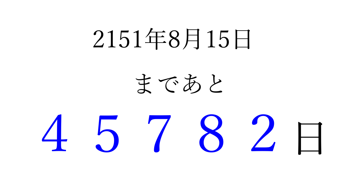 2151年8月15日(日)まで あと 99999 日です 追加すると、トップページからすぐ選べるようになります ※2026/04/10現在の結果です。 最新の状態に更新する ↓シェアして、タイムライン上にカウントダウンを表示しよう!↓ 📤 この結果を共有する Tweet シェア Threads Bluesky 別の日付でカウントダウン 2151年8月のカレンダー このページをブックマークに追加すると、いつでもカウントダウンを確認できます。 (PC: Ctrl+D / Mac: ⌘+D) hitome-notes.comでは以下のページも運営しています。 指定日と期間から日付を計算 | ガチャ確率計算・シミュレーション | プライバシー・ポリシー 運営者:Avocado