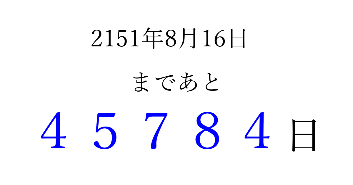 2151年8月16日(月)まで あと 99999 日です 追加すると、トップページからすぐ選べるようになります ※2026/04/09現在の結果です。 最新の状態に更新する ↓シェアして、タイムライン上にカウントダウンを表示しよう!↓ 📤 この結果を共有する Tweet シェア Threads Bluesky 別の日付でカウントダウン 2151年8月のカレンダー このページをブックマークに追加すると、いつでもカウントダウンを確認できます。 (PC: Ctrl+D / Mac: ⌘+D) hitome-notes.comでは以下のページも運営しています。 指定日と期間から日付を計算 | ガチャ確率計算・シミュレーション | プライバシー・ポリシー 運営者:Avocado