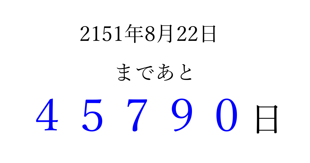 2151年8月22日(日)まで あと 99999 日です 追加すると、トップページからすぐ選べるようになります ※2026/04/09現在の結果です。 最新の状態に更新する ↓シェアして、タイムライン上にカウントダウンを表示しよう!↓ 📤 この結果を共有する Tweet シェア Threads Bluesky 別の日付でカウントダウン 2151年8月のカレンダー このページをブックマークに追加すると、いつでもカウントダウンを確認できます。 (PC: Ctrl+D / Mac: ⌘+D) hitome-notes.comでは以下のページも運営しています。 指定日と期間から日付を計算 | ガチャ確率計算・シミュレーション | プライバシー・ポリシー 運営者:Avocado